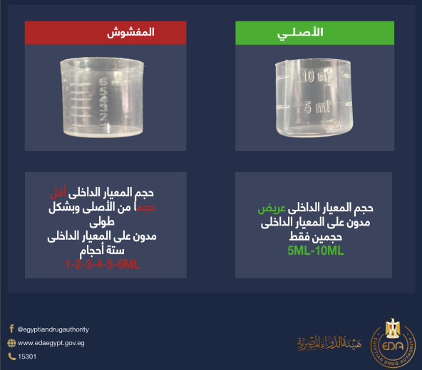 العبوات المغشوشة: حجم المعيار الداخلي أقل من الأصلي وذو شكل طولي ومدون عليه 1,2,3,4,5,6ml