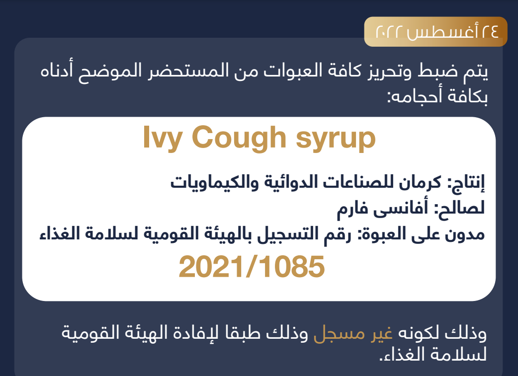 قررت هيئة الدواء المصرية، ضبط وتحريز كافة العبوات من مستحضر Ivy Cough syrup الذي يستخدم لعلاج البرد والتهاب الغشاء المخاطي، وأعراض التهاب القصبات الهوائية.