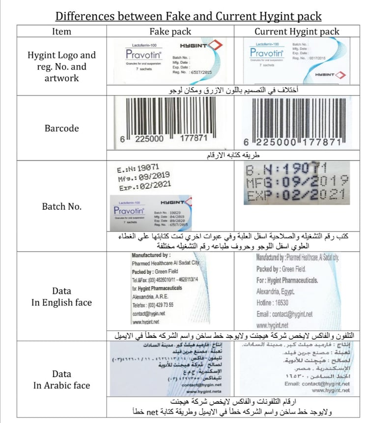 وقالت شركة هيجنت للأدوية أن أرقام تشغيلات العلب المقلدة من مستحضر برافوتين PRAVOTIN جاءت كالتالي ، 18146 – 19014 – 19015 – 19016 – 19029 – 19071 – 19095 – 19096 – 19097 – 19198 – 19099 .