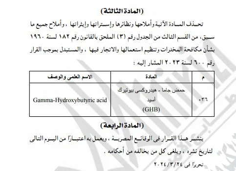 كما نصت المادة الثالثة من القرار على حذف حمض جاما – هيدروكسي بيوتيرك اسید (GHB) الاسم العلمي والوصف Gamma-Hydroxybutyric acid وأملاحها ونظائرها وإستراتها وإيثراتها ، وأملاح جميع ما سبق، من القسم الثالث من الجدول رقم (۳) الملحق بالقانون رقم ١٨٢ لسنة ١٩٦٠ بشأن مكافحة المخدرات وتنظيم استعمالها والاتجار فيها ، والمستبدل بموجب القرار رقم ٦٠٠ لسنة ٢٠٢٣.