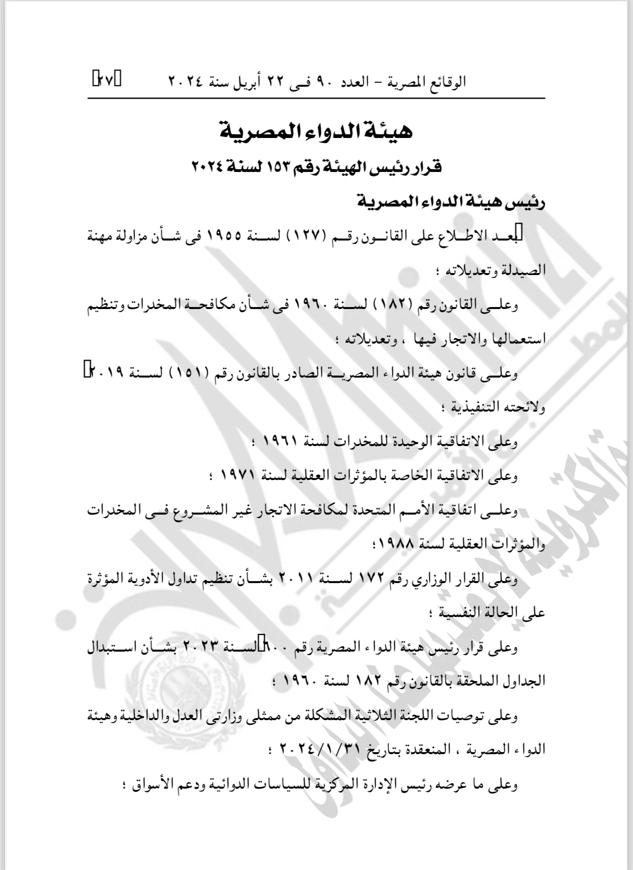وأكدت الهيئة أن هذه القرارات جاءت بعد الإطلاع على كافة القوانين والاتفاقيات الخاصة بتنظيم تداول الأدوية المؤثرة على الحالة النفسية، ومن بينها القانون رقم (۱۲۷) لسنة ١٩٥٥ في شأن مزاولة مهنة الصيدلة وتعديلاته، وعلى القانون رقم (۱۸۲) لسنة ١٩٦٠ في شأن مكافحة المخدرات وتنظيم استعمالها والاتجار فيها، وتعديلاته، وعلى قانون هيئة الدواء المصرية الصادر بالقانون رقم (١٥١) لسنة ٢٠١٩ ولائحته التنفيذية، وعلى الاتفاقية الوحيدة للمخدرات لسنة ١٩٦١.