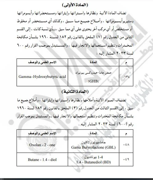 ونص القرار في مادته الأولى على إضافة حمض جاما – هيدروكسي بيوتيرك « GHB» الاسم العلمي Gamma-Hydroxybutyric acid ونظائرها واستراتها وإيثراتها ومستحضراتها وأيسومراتها وستيريو أيسومراتها ، وأملاح جميع ما سبق، وكذلك أي مستحضر أو مخلوط أو مستخلص أو أي مركب آخر يحتوى على أي مما سبق، وبأي نسبة كانت، إلى القسم الثاني من الجدول رقم (۱) الملحق بالقانون رقم ۱۸۲ لسنة ١٩٦٠ بشأن مكافحة المخدرات وتنظيم استعمالها والاتجار فيها، والمستبدل بموجب القرار رقم ٦٠٠ السنة ۲۰۲۳ المشار إليه.