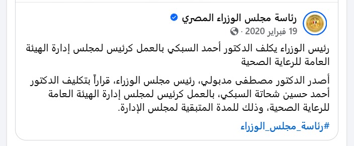 أعاد الدكتور أحمد السبكي رئيس الهيئة العامة للرعاية الصحية، والمشرف العام على مشروع التأمين الصحي الشامل، نشر قرار تكليفه برئاسة هيئة الرعاية الصحية المنشور بتاريخ 19 فبراير 2020 عبر صفحة مجلس الوزراء بموقع التواصل الاجتماعي فيس بوك.