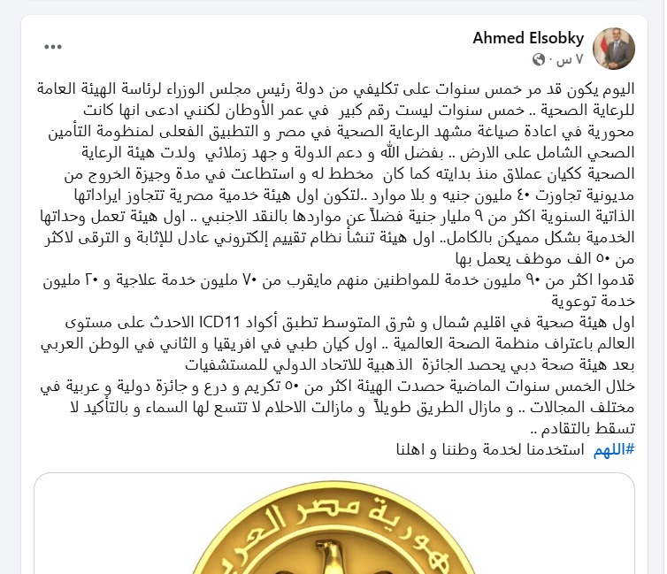 وكتب السبكي عبر صفحته في “فيس بوك”: “اليوم يكون قد مر خمس سنوات على تكليفي من دولة رئيس مجلس الوزراء لرئاسة الهيئة العامة للرعاية الصحية.. خمس سنوات ليست رقم كبير في عمر الأوطان لكنني أدعى أنها كانت محورية في إعادة صياغة مشهد الرعاية الصحية في مصر والتطبيق الفعلي لمنظومة التأمين الصحي الشامل على الأرض.
