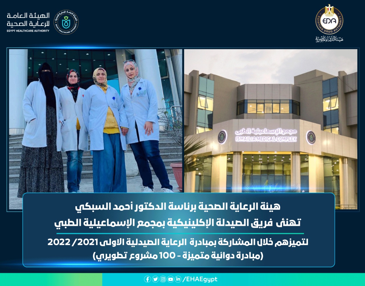 كما هنأت الهيئة فريق الصيدلية الإكلينيكية بمجمع الإسماعيلية الطبي التابع للهيئة بمحافظة الإسماعيلية، لتميزهم وحصولهم على المركز الثاني “مكرر” على مستوى الجمهورية، ضمن 37 مشروعًا مشارك بمبادرة هيئة الدواء المصرية للرعاية الصيدلية “ممارسة دوائية متميزة-100 مشروع تطويري” 2021/ 2022.